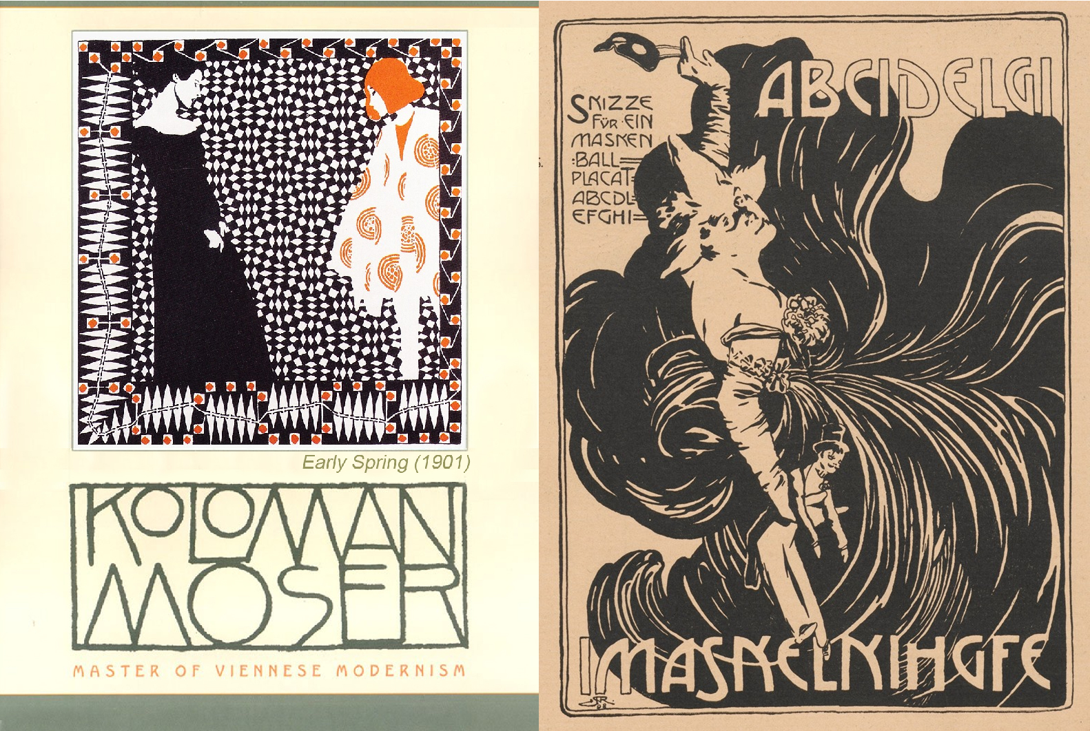 알프레드 롤러와 콜로만 모저는 포스터와 지면에서 강한 평면 처리와 실루엣, 명료한 정렬을 밀어붙인다. 색은 제한하고, 여백은 크게 두고, 활자는 굵고 간결하게 정렬했다.