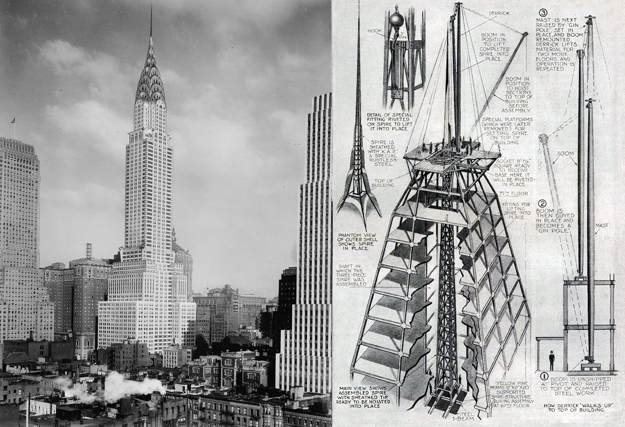 (The Chrysler Building, New York (1930) and its spire construction diagram.
