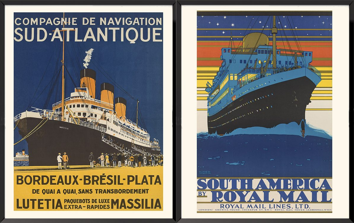 (Kenneth Shoesmith, South America by Royal Mail (1930) / Sandy Hook, Compagnie de Navigation Sud-Atlantique (1920).)