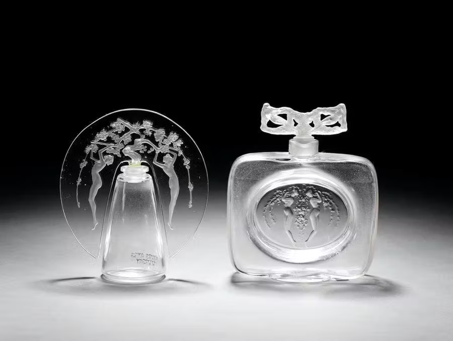 (René Lalique, "Deux Figurines" bottle made of clear and frosted glass, 1912, and another bottle for D'Orsay. photo by Bonhams)